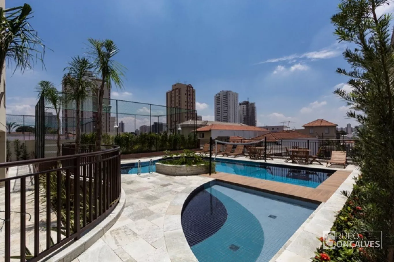 Terraço com churrasqueira, Sauna, Salão de jogos, Salão de Festas, Piscinas Adulto e Infantil, Fitness, Ducha circular, Churrasqueira e forno à lenha, Brinquedoteca, Quadra esportiva